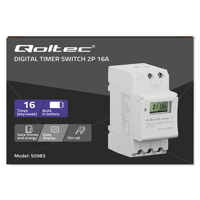 Qoltec Elektroniczny programator czasowy TIMER na szynę DIN z wbudowaną baterią | Haromonogram 7 dni | 16 programów
