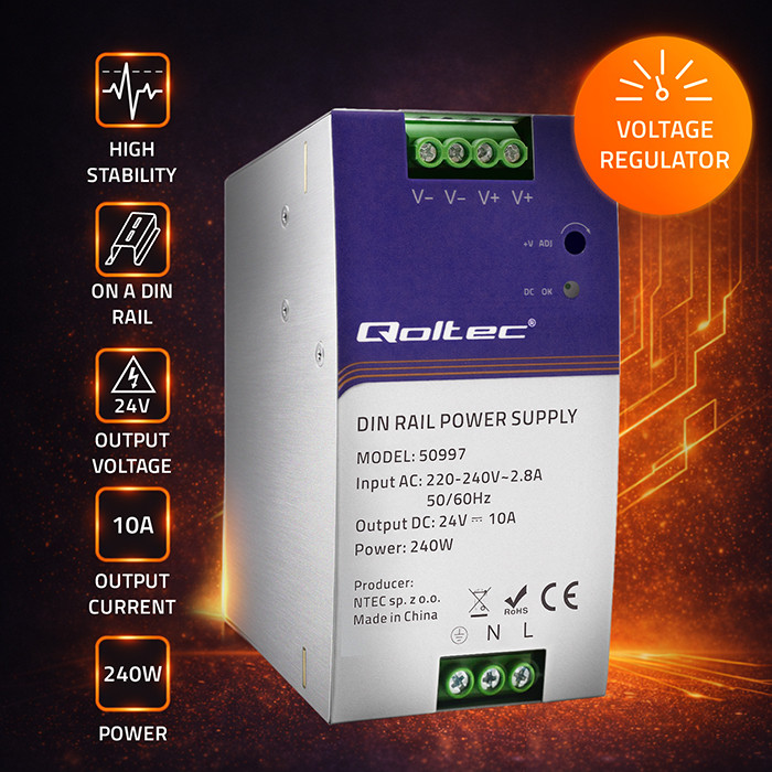 Qoltec Przemysłowy zasilacz na szynę DIN | 240W | 24V | 10A