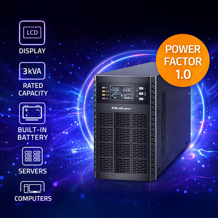 Qoltec Zasilacz awaryjny UPS | 3kVA | 3000W | Power Factor 1.0 | LCD | EPO | USB | On-line