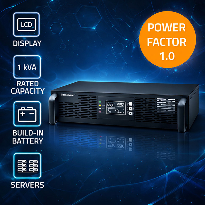 Qoltec Zasilacz awaryjny UPS do RACK | 1kVA | 1000W | Power Factor 1.0 | LCD | EPO | USB | On-line