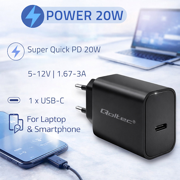 Qoltec Ładowarka Super Quick PD | USB-C | 20W | 5-12V | 1.67-3A | Czarna