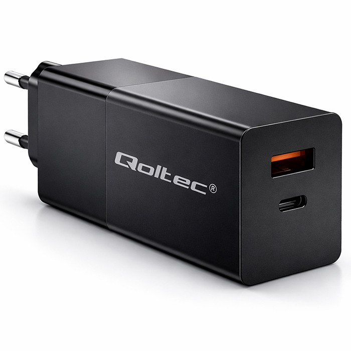 Qoltec Ładowarka GaN POWER PRO | 1xUSB-C | 1xUSB | 100W | 5-20V | 1.5-5A | PD | Laptop | Smartfon | Czarna