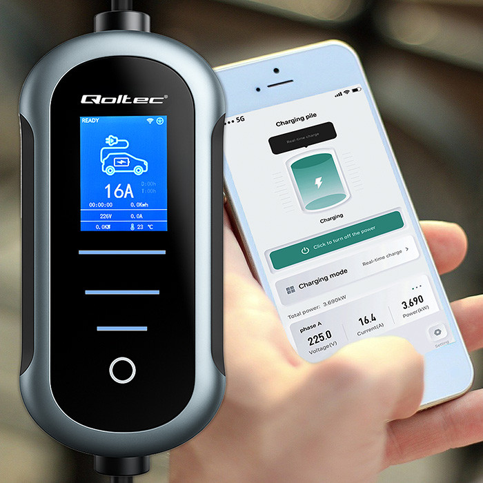 Qoltec Mobilna ładowarka do samochodu elektrycznego EV z regulacją 2w1 Typ2 | 3.5kW | 230V | Wi-fi | TUYA | SMART LIFE | LCD | Przenośna | 5m