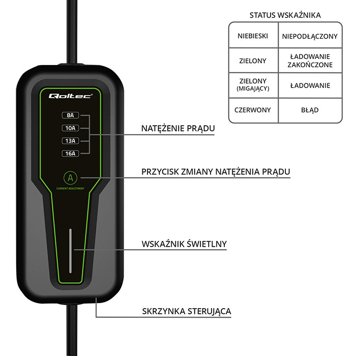 Wysoka moc ładowania, 7-stykowe złącze typu 2 zgodne z obowiązującymi przepisami, Cztery opcje (8A, 10A, 13A, 16A) dla optymalnego ładowania Ładowarka posiada złącze typu 2, które jest obecnie oficjalnym standardem Unii Europejskiej i ładuje auta elektryczne wyposażone w odpowiednie gniazdo ładowania. Złącze typu 2 to 7 styków, z których 3 styki lub 5 przeznaczone są do ładowania, a 2 do komunikacji między stacją a samochodem. Kompatybilne z większością samochodów elektrycznych sprzedawanych w Europie. Ładowarka marki Qoltec obsługuje cztery tryby natężenia prądu 8A, 10A, 13A i 16A. Warto dodać, że złącze typu 2 jest przeznaczone dla pojazdów elektrycznych o mocy ładowania większej niż 3kW.