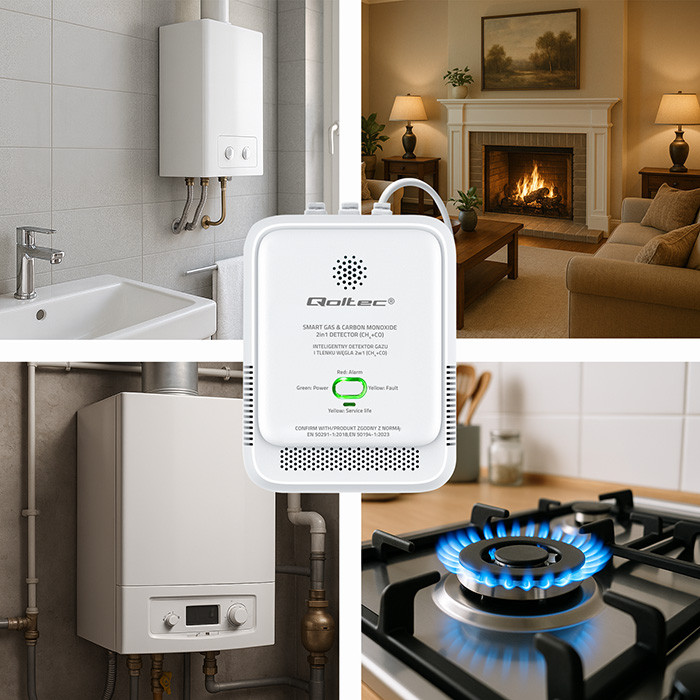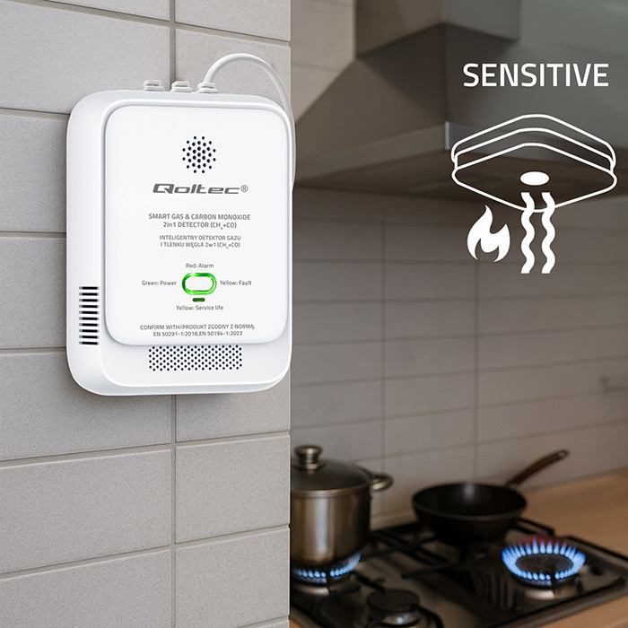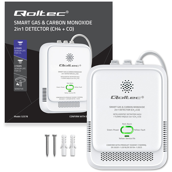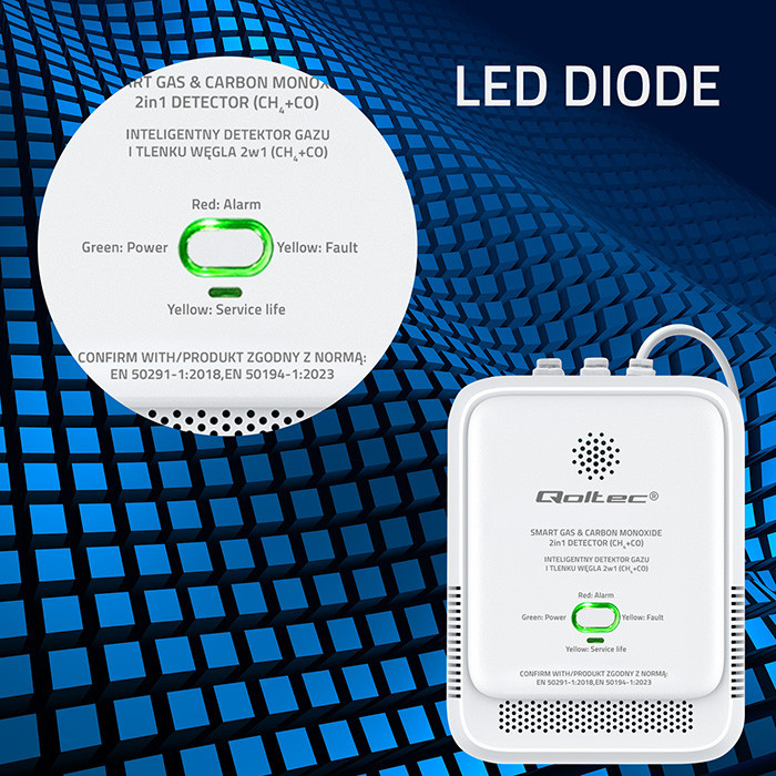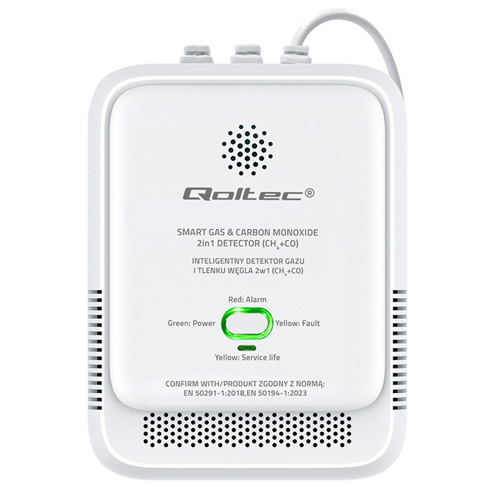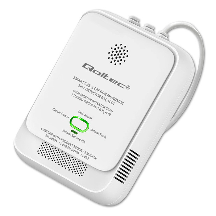 Qoltec Certyfikowany Czujnik wycieku gazu ziemnego i tlenku węgla (czadu) | detektor CH4 CO | alarm 85dB | LED