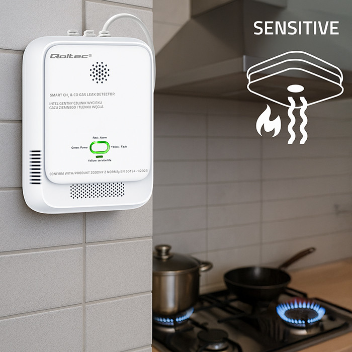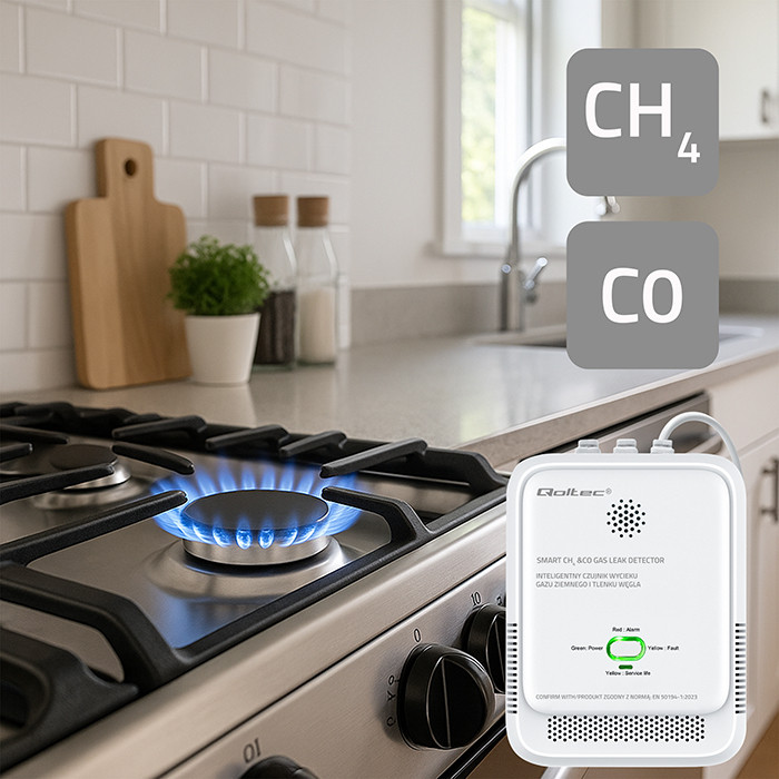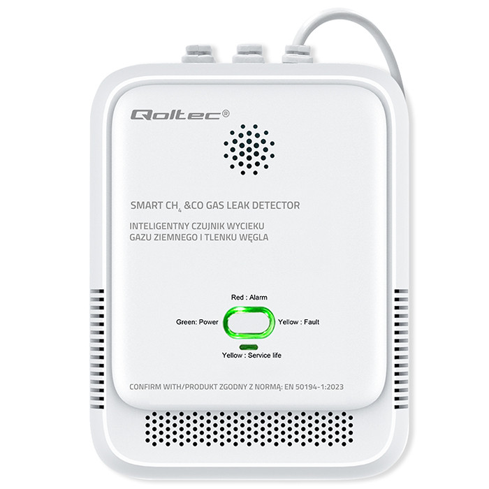 Qoltec Certyfikowany Czujnik wycieku gazu ziemnego i tlenku węgla (czadu) | detektor CH4 CO | żywotność sensora 5 lat | alarm 85dB | LED