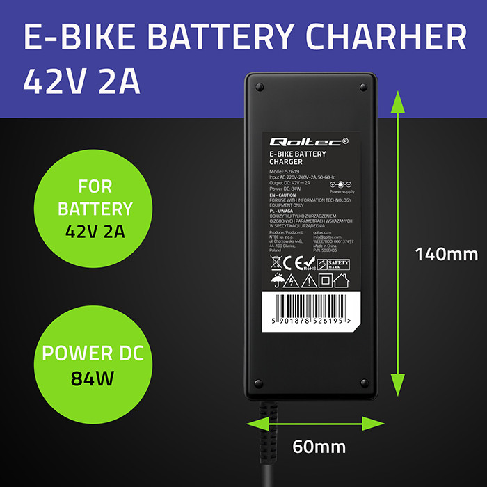 Ładowarka mobilna marki Qoltec o napięciu 42V i natężeniu ładowania 2A z wtykiem GX12-3Pin oraz ogólnej mocy ładowania 84W dedykowana do akumulatorów litowo-jonowych 36V, pozwala na naładowanie baterii z dowolnego gniazdka elektrycznego 230V. To wygodne i funkcjonalne rozwiązanie z zaawansowaną elektroniką, chroni twoją baterię podczas procesu ładowania.