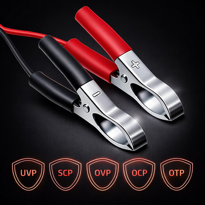 Inteligentny wskaźnik LED informuje Cię na bieżąco o etapie procesu ładowania – bez konieczności odłączania urządzenia czy mierzenia napięcia. Czerwona dioda oznacza trwające ładowanie, a po jego zakończeniu – zielona informuje, że akumulator jest w pełni gotowy do pracy. Automatyczne zabezpieczenia chronią przed przepięciem, przeładowaniem i błędnym podłączeniem, a inteligentny system ładowania zadba o Twój akumulator od startu do pełnego naładowania.