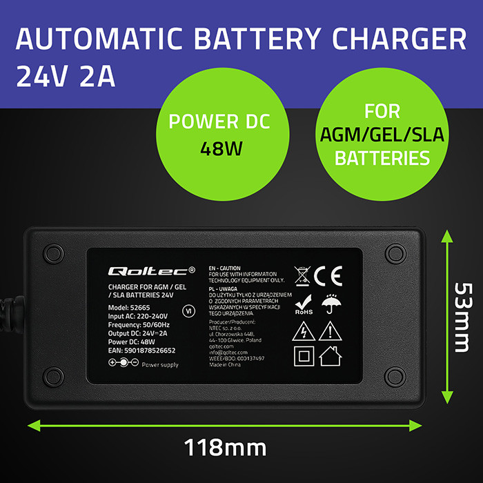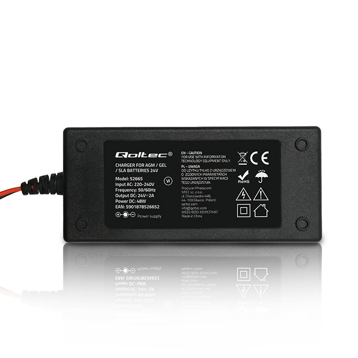 Qoltec Automatyczna ładowarka do akumulatora AGM GEL STD | Prostownik 24V | 2A | 48W | LED | Kabel 1.8m