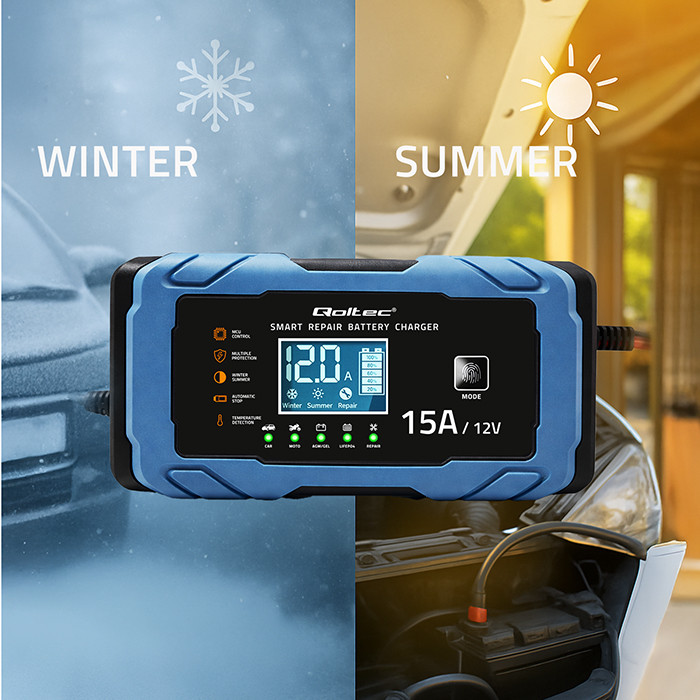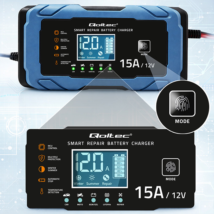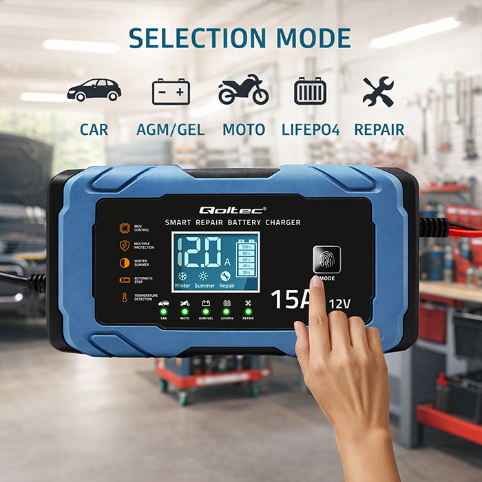 Qoltec Inteligentna mikroprocesorowa ładowarka 12V 15A | Prostownik z funkcją naprawy | AGM GEL LiFePO4 | 9- stopniowe ładowanie