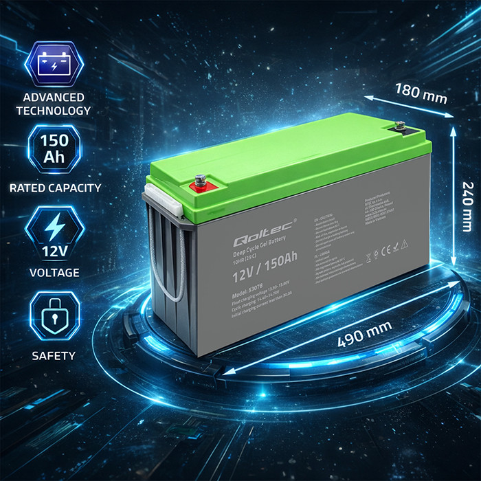 Qoltec Akumulator żelowy Deep Cycle | 12V | 150Ah | 44.5kg | Bezobsługowy | Professional | LongLife | PV, UPS, kamper