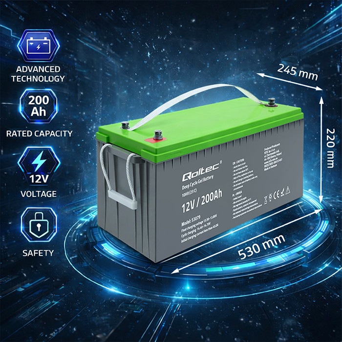 Qoltec Akumulator żelowy Deep Cycle | 12V | 200Ah | 62.5kg | Bezobsługowy | Professional | LongLife | PV, UPS, kamper