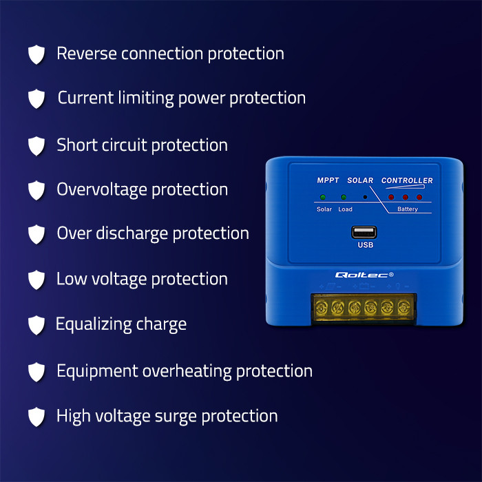• Zabezpieczenie przed nadmiernym rozładowaniem akumulatora : odłącza obciążenie, gdy napięcie spadnie poniżej bezpiecznego poziomu