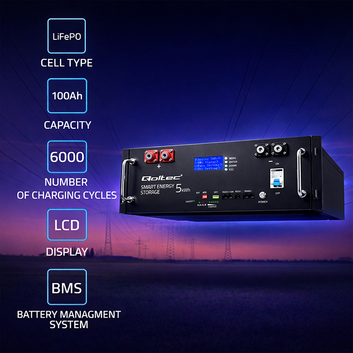 Qoltec Stabilny Magazyn energii LiFePO4 do RACK | 5.12kWh | 51.2V | 100Ah | BMS | LCD