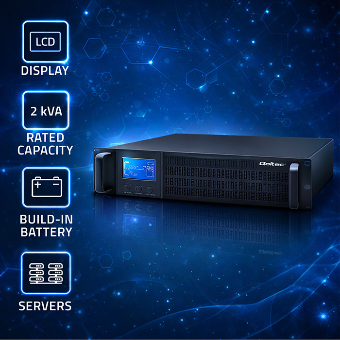 Zasilacze UPS RACK marki Qoltec to stabilna pozbawiona zakłóceń czysta energia o sinusoidalnym kształcie. To pełna ochrona twoich urządzeń, dzięki podwójnej konwersji, która najpierw przekształca prąd przemienny zasilania sieciowego na prąd stały, a następnie na prąd przemienny, co zapewnia najwyższy poziom jakości zasilania i zabezpiecza przez potencjalnymi zakłóceniami w sieci takimi jak spadki napięcia, zaniki energii, przepięcia i awarie.