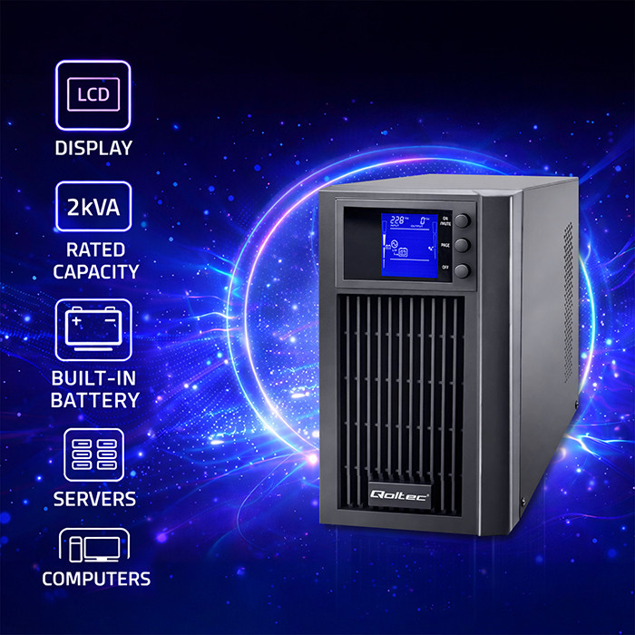 Qoltec Zasilacz awaryjny UPS On-line | Pure Sine Wave | 2kVA | 1.6kW | LCD | USB