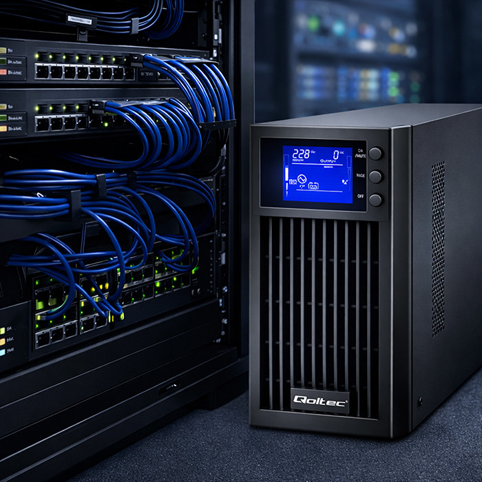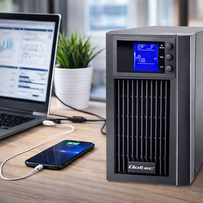 Zasilacze UPS online marki Qoltec to stabilna pozbawiona zakłóceń czysta energia o sinusoidalnym kształcie. To pełna ochrona twoich urządzeń, dzięki podwójnej konwersji, która najpierw przekształca prąd przemienny zasilania sieciowego na prąd stały, a następnie na prąd przemienny, co zapewnia najwyższy poziom jakości zasilania i zabezpiecza przez potencjalnymi zakłóceniami w sieci takimi jak spadki napięcia, zaniki energii, przepięcia i awarie.