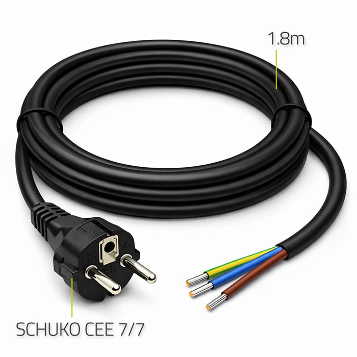 Wyjątkowa jakość wykonania tego kabla w standardzie HD5VV-F gwarantuje trwałość i bezpieczeństwo, nawet przy intensywnym użytkowaniu. Solidna elastyczna izolacja wykonana z polwinitu (PVC) i trzy wysokiej klasy miedziane żyły sprawiają, że możesz polegać na stabilnym przepływie energii bez ryzyka przegrzania czy awarii. Odpowiednio dobrana długość przewodu 1.8m zapewnia swobodę podłączania urządzeń w trudno dostępnych miejscach, eliminując problem nieporęcznych, plączących się kabli. Zastosowana standardowa kolorystyka żył ułatwia prawidłowe podłączenie: brązowy – przewód fazowy (L), niebieski – przewód neutralny (N), żółto-zielony - przewód ochronny (PE).
