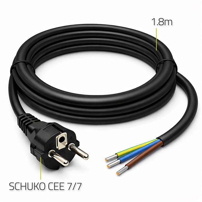 Funkcjonalny przewód zasilający do podłączania urządzeń elektrycznych do sieci 230V. Zakończony z jednej strony wtyczką CEE 7/7, a z drugiej przygotowanymi do montażu wolnymi lutowanymi odizolowanymi przewodami. To doskonały wybór dla instalacji wymagających indywidualnego dopasowania przewodu. Zaufaj jakości, która gwarantuje pełną satysfakcję!