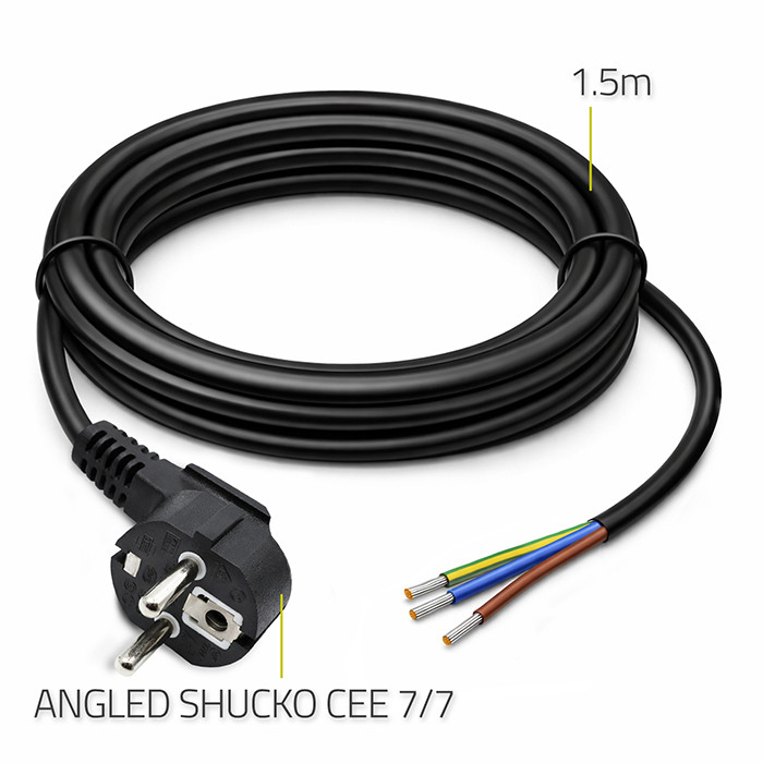 Funkcjonalny przewód zasilający do podłączania urządzeń elektrycznych do sieci 230V. Zakończony z jednej strony wtyczką CEE 7/7, a z drugiej przygotowanymi do montażu wolnymi lutowanymi odizolowanymi przewodami. To doskonały wybór dla instalacji wymagających indywidualnego dopasowania przewodu. Zaufaj jakości, która gwarantuje pełną satysfakcję!