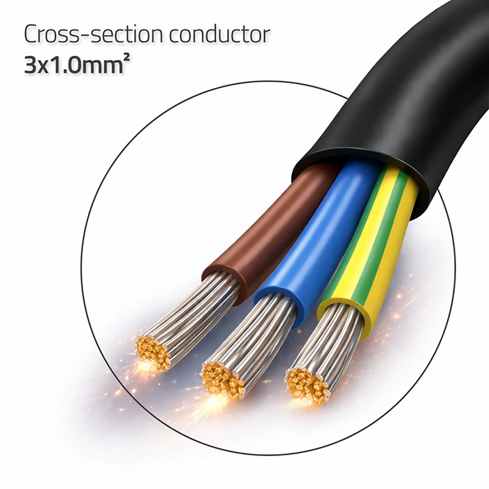 Wyjątkowa jakość wykonania tego kabla w standardzie HD5VV-F gwarantuje trwałość i bezpieczeństwo, nawet przy intensywnym użytkowaniu. Solidna elastyczna izolacja wykonana z polwinitu (PVC) i trzy wysokiej klasy miedziane żyły sprawiają, że możesz polegać na stabilnym przepływie energii bez ryzyka przegrzania czy awarii. Odpowiednio dobrana długość przewodu 1.8m zapewnia swobodę podłączania urządzeń w trudno dostępnych miejscach, eliminując problem nieporęcznych, plączących się kabli. Zastosowana standardowa kolorystyka żył ułatwia prawidłowe podłączenie: brązowy – przewód fazowy (L), niebieski – przewód neutralny (N), żółto-zielony - przewód ochronny (PE).