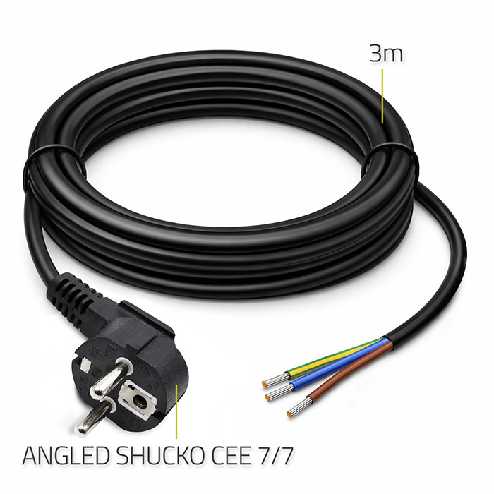 Funkcjonalny przewód zasilający do podłączania urządzeń elektrycznych do sieci 230V. Zakończony z jednej strony wtyczką CEE 7/7, a z drugiej przygotowanymi do montażu wolnymi lutowanymi odizolowanymi przewodami. To doskonały wybór dla instalacji wymagających indywidualnego dopasowania przewodu. Zaufaj jakości, która gwarantuje pełną satysfakcję!