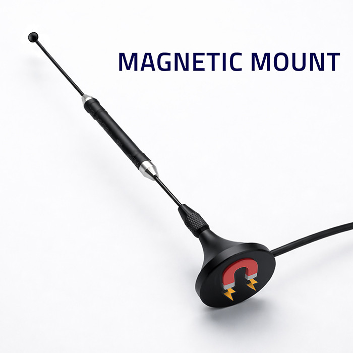 Antena została wyposażona w magnetyczną podstawę, która umożliwia szybki i stabilny montaż na metalowych powierzchniach, takich jak dach pojazdu czy elementy karoserii. Silny magnes zapewnia pewne trzymanie nawet podczas jazdy, minimalizując ryzyko przesunięcia lub odpadnięcia anteny. Dzięki temu rozwiązaniu instalacja nie wymaga wiercenia ani użycia dodatkowych narzędzi, a antenę można w każdej chwili łatwo zdjąć i przenieść w inne miejsce.