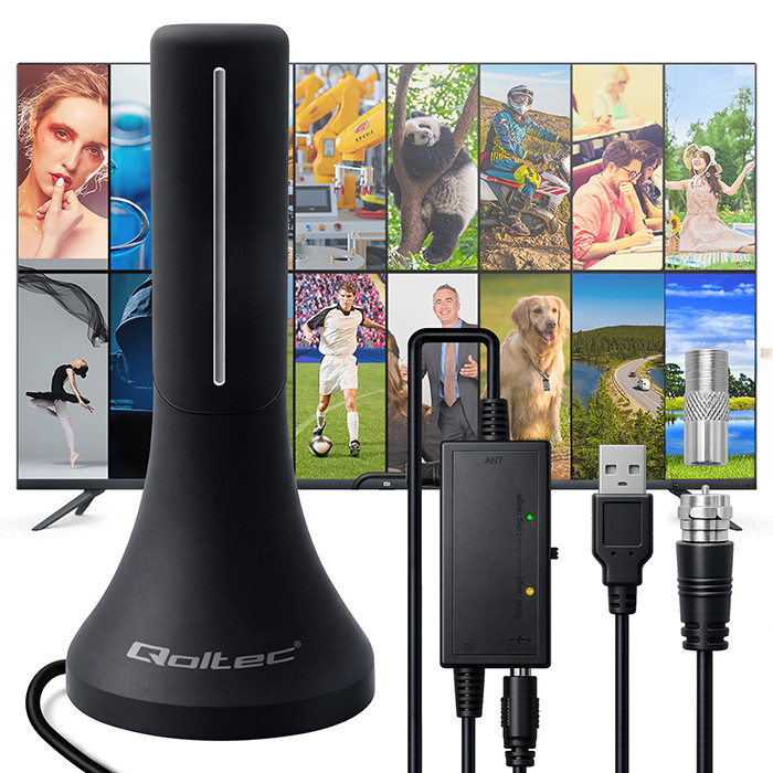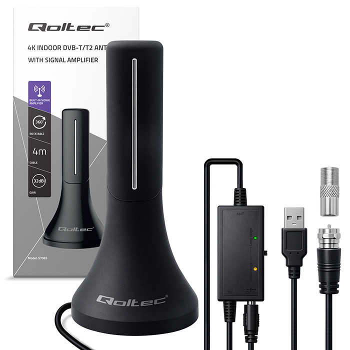 Qoltec Wewnętrzna mocna Antena TV DVB-T/T2 | wzmacniacz sygnału | 4K | wysoki zysk 32dBi | 360º | Kabel 4m