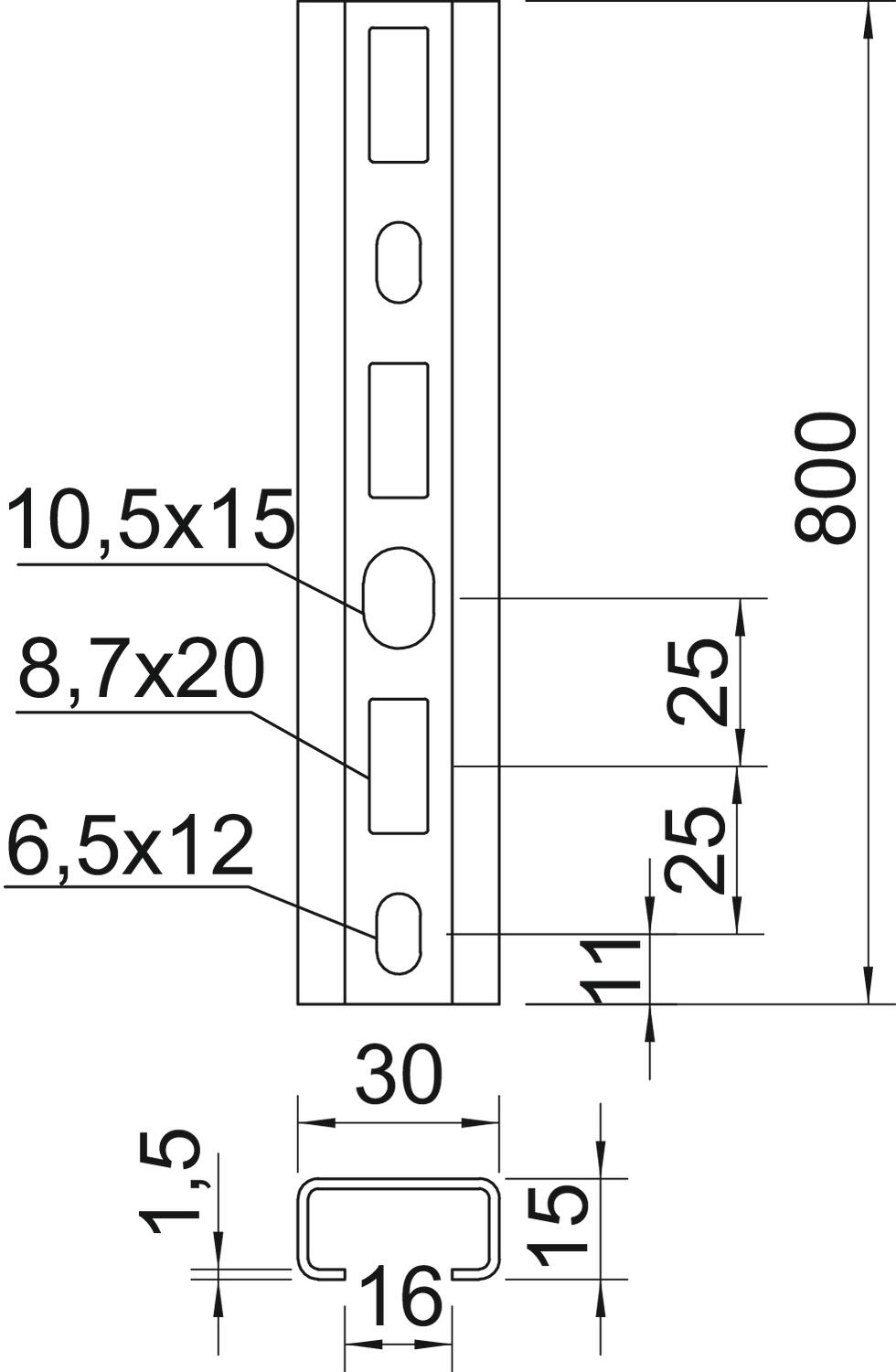 Szyna profilowa perforowana, o szerokości szczeliny 16 mm.