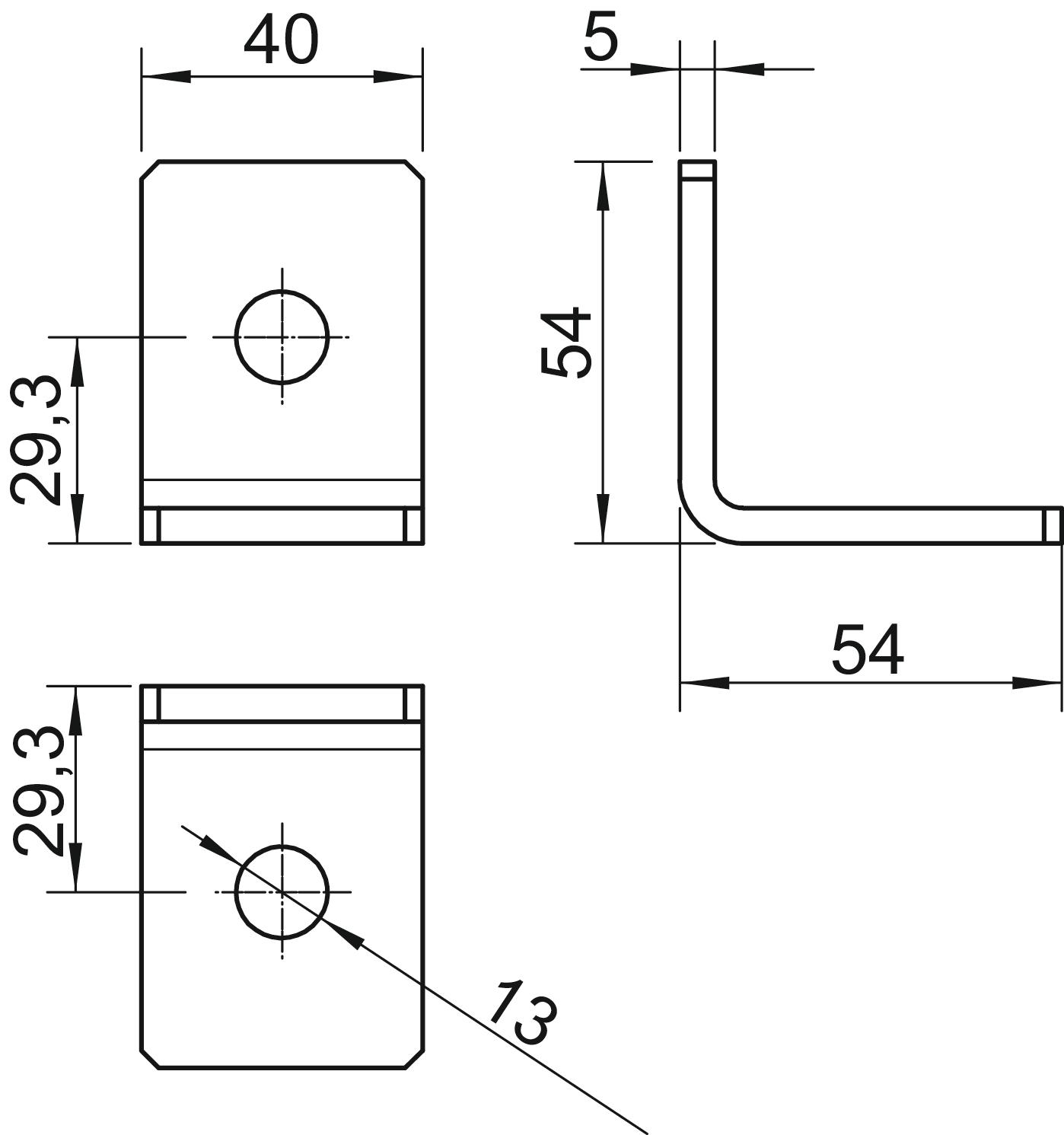 Kątownik montażowy z 2 otworami do łączenia szyn profilowych 41 x 41 mm i 41 x 21 mm pod kątem 90°.