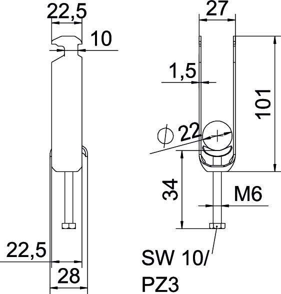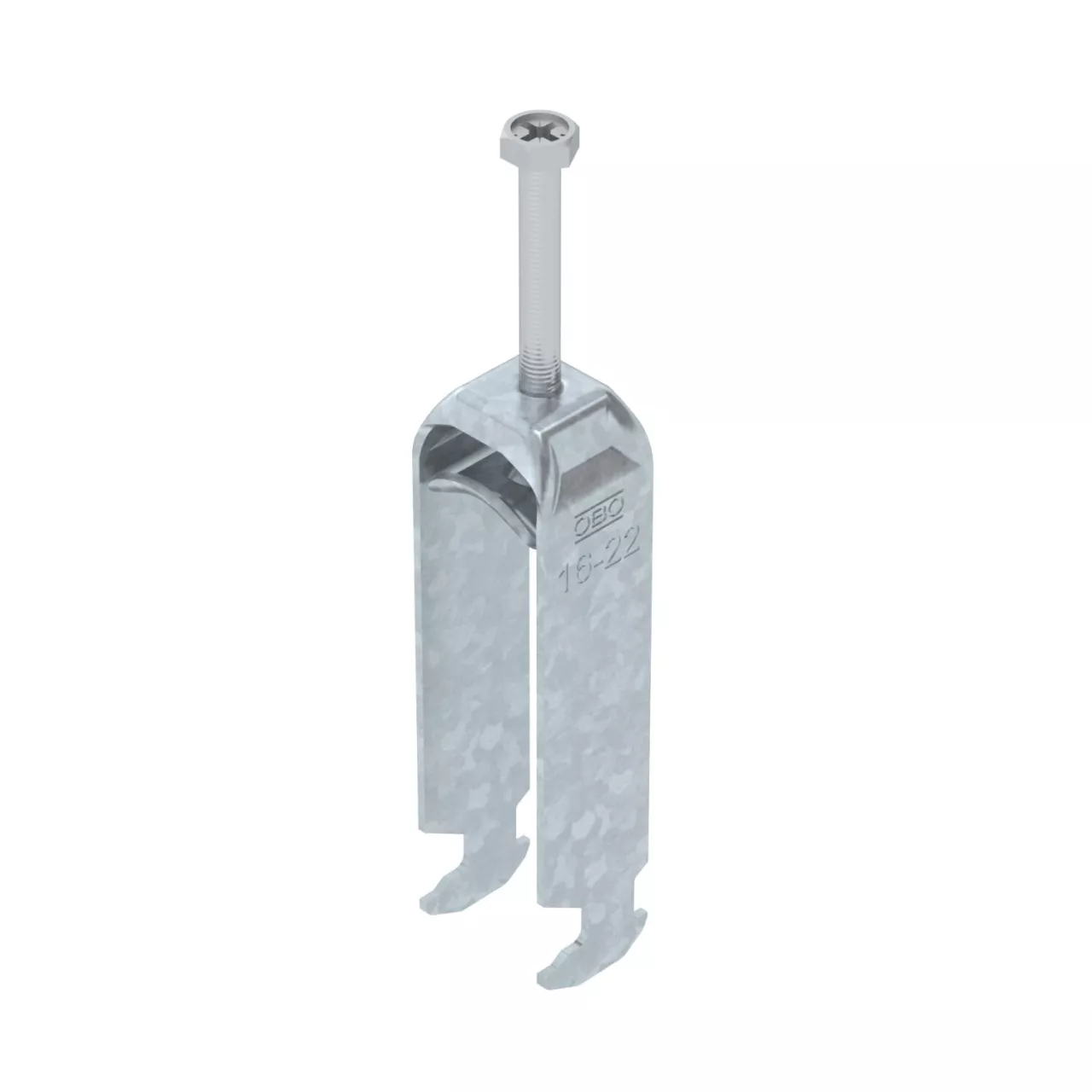 Obejma kabłąkowa ze stopką z łbem młotkowym, metalowa wanienka dociskowa, z zaokrąglonymi krawędziami do ochrony kabli. Do pionowego i poziomego montażu 3 pojedynczych kabli na szynach o profilu C. Do szczeliny o szerokości 16 - 17 mm. Z gwintem jednoskokowym na wanience dociskowej, łeb sześciokątny uniwersalny SW10, z rowkiem i łbem krzyżakowym Nadaje się do montażu wewnątrz i na zewnątrz Paczki kabli powinny być oddzielone dodatkową wanienką dociskową Zalecamy użycie wanienki dociskowej