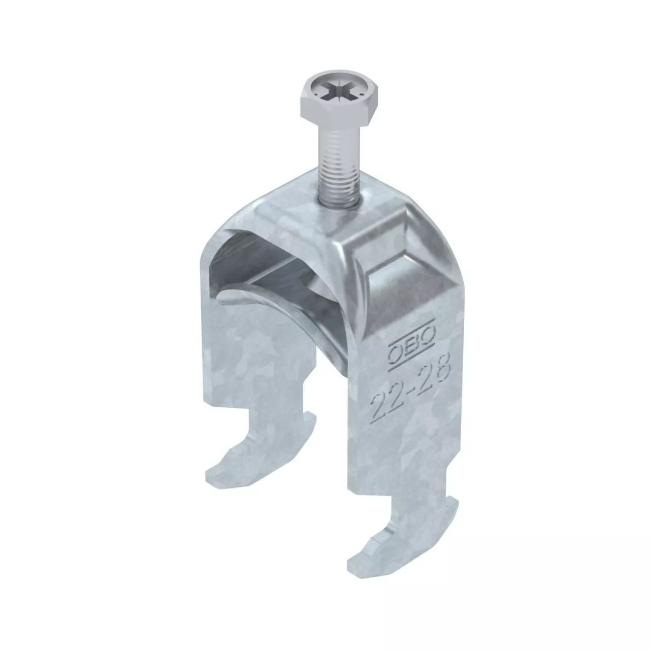Obejma kabłąkowa ze stopką z łbem młotkowym, metalowa wanienka dociskowa, z zaokrąglonymi krawędziami do ochrony kabli. Do pionowego i poziomego montażu pojedynczego kabla na szynie o profilu C. Do szczeliny o szerokości 16 - 17 mm. Z gwintem jednoskokowym na wanience dociskowej, łeb sześciokątny uniwersalny SW10, z rowkiem i łbem krzyżakowym Nadaje się do montażu wewnątrz i na zewnątrz Wanienkę dociskową należy zamówić oddzielnie.