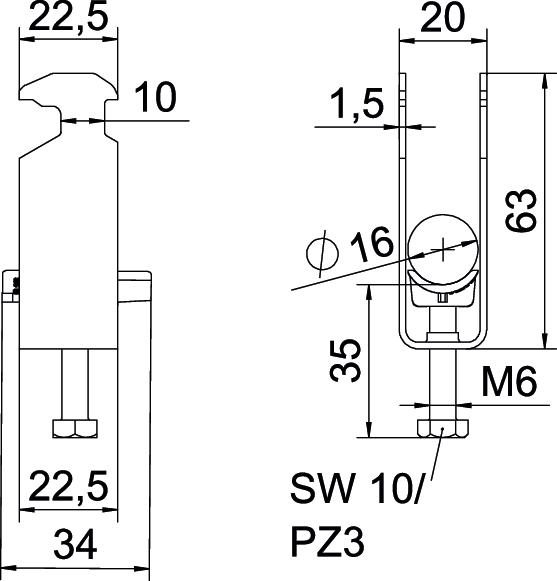 Obejma kabłąkowa ze stopką z łbem młotkowym, plastikowa wanienka dociskowa z polipropylenu Do pionowego i poziomego montażu 2 pojedynczych kabli na szynach o profilu C. Do szczeliny o szerokości 16 - 17 mm. Z gwintem jednoskokowym na wanience dociskowej, łeb sześciokątny uniwersalny SW10, z rowkiem i łbem krzyżakowym Nadaje się do montażu wewnątrz i na zewnątrz Paczki kabli powinny być oddzielone dodatkową wanienką dociskową Zalecamy użycie wanienki dociskowej