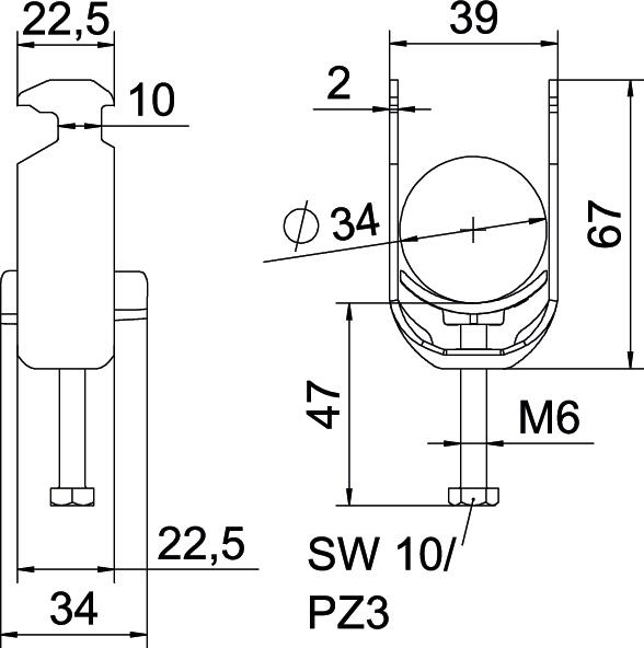 Obejma kabłąkowa ze stopką z łbem młotkowym, plastikowa wanienka dociskowa z polipropylenu Do pionowego i poziomego montażu pojedynczego kabla na szynie o profilu C. Do szczeliny o szerokości 16 - 17 mm. Z gwintem jednoskokowym na wanience dociskowej, łeb sześciokątny uniwersalny SW10, z rowkiem i łbem krzyżakowym Nadaje się do montażu wewnątrz i na zewnątrz Zalecamy użycie wanienki dociskowej