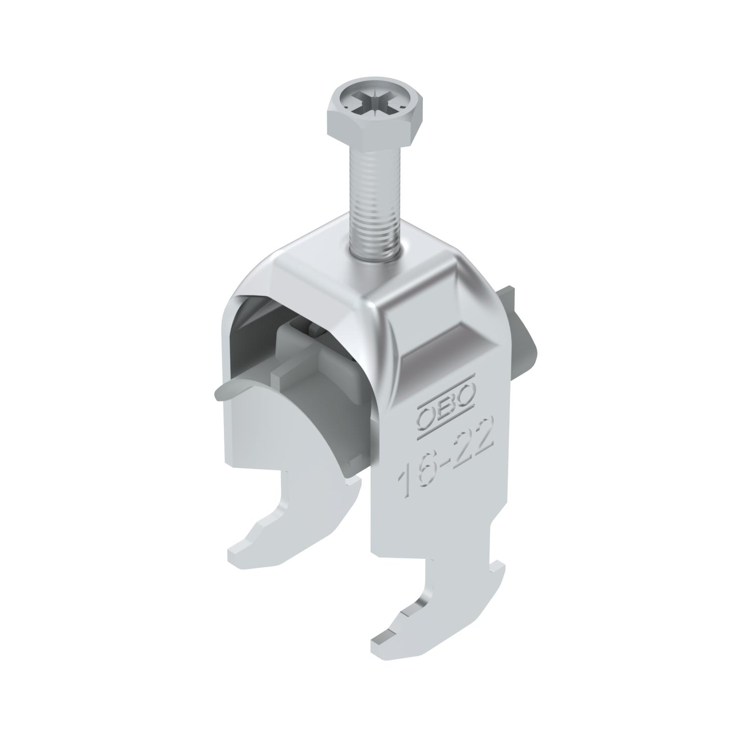 Obejma kabłąkowa ze stopką z łbem młotkowym, plastikowa wanienka dociskowa z polipropylenu Do pionowego i poziomego montażu pojedynczego kabla na szynie o profilu C. Do szczeliny o szerokości 16 - 17 mm. Z gwintem jednoskokowym na wanience dociskowej, łeb sześciokątny uniwersalny SW10, z rowkiem i łbem krzyżakowym Nadaje się do montażu wewnątrz i na zewnątrz Zalecamy użycie wanienki dociskowej