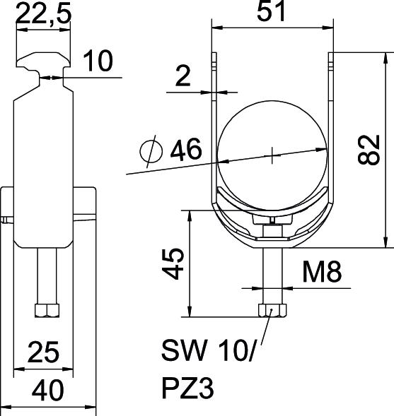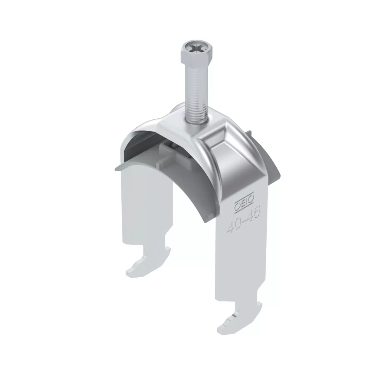 Obejma kabłąkowa ze stopką z łbem młotkowym, plastikowa wanienka dociskowa z polipropylenu Do pionowego i poziomego montażu pojedynczego kabla na szynie o profilu C. Do szczeliny o szerokości 16 - 17 mm. Z gwintem jednoskokowym na wanience dociskowej, łeb sześciokątny uniwersalny SW10, z rowkiem i łbem krzyżakowym Nadaje się do montażu wewnątrz i na zewnątrz Zalecamy użycie wanienki dociskowej