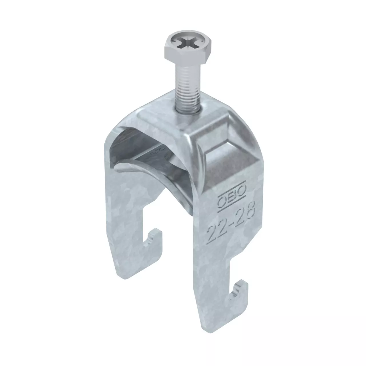 Obejma kabłąkowa ze stopką w kształcie U, metalowa wanienka dociskowa z zaokrąglonymi krawędziami do ochrony kabli. Do pionowego i poziomego montażu pojedynczego kabla na szynie o profilu C. Szerokość szczeliny 18-22 mm Z gwintem jednoskokowym na wanience dociskowej, łeb sześciokątny uniwersalny SW10, z rowkiem i łbem krzyżakowym Nadaje się do montażu wewnątrz i na zewnątrz Zalecamy użycie wanienki dociskowej