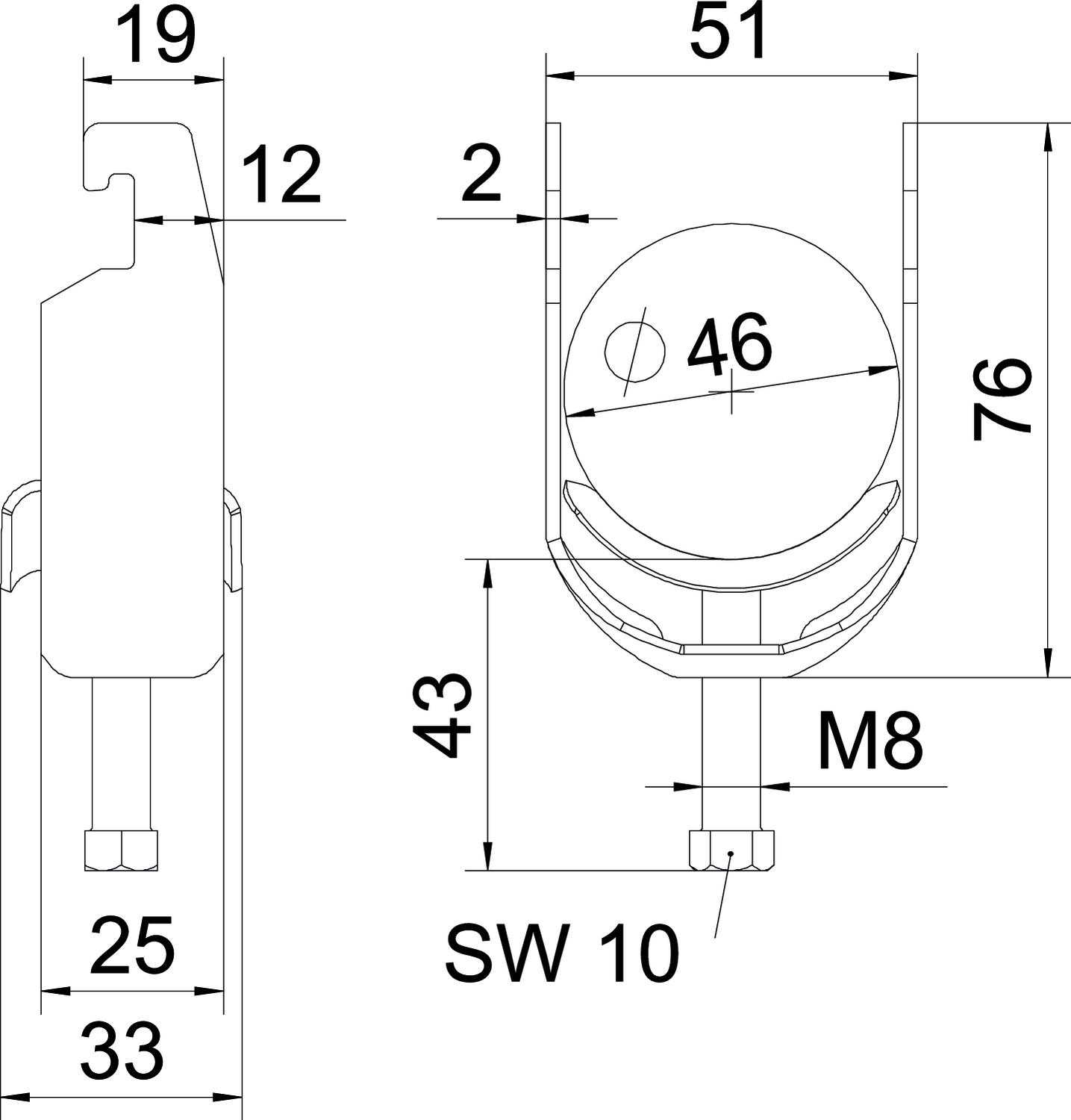 Obejma kabłąkowa ze stopką w kształcie U, metalowa wanienka dociskowa z zaokrąglonymi krawędziami do ochrony kabli. Do pionowego i poziomego montażu pojedynczego kabla na szynie o profilu C. Szerokość szczeliny 18-22 mm Z gwintem jednoskokowym na wanience dociskowej, łeb sześciokątny uniwersalny SW10, z rowkiem i łbem krzyżakowym Nadaje się do montażu wewnątrz i na zewnątrz Zalecamy użycie wanienki dociskowej