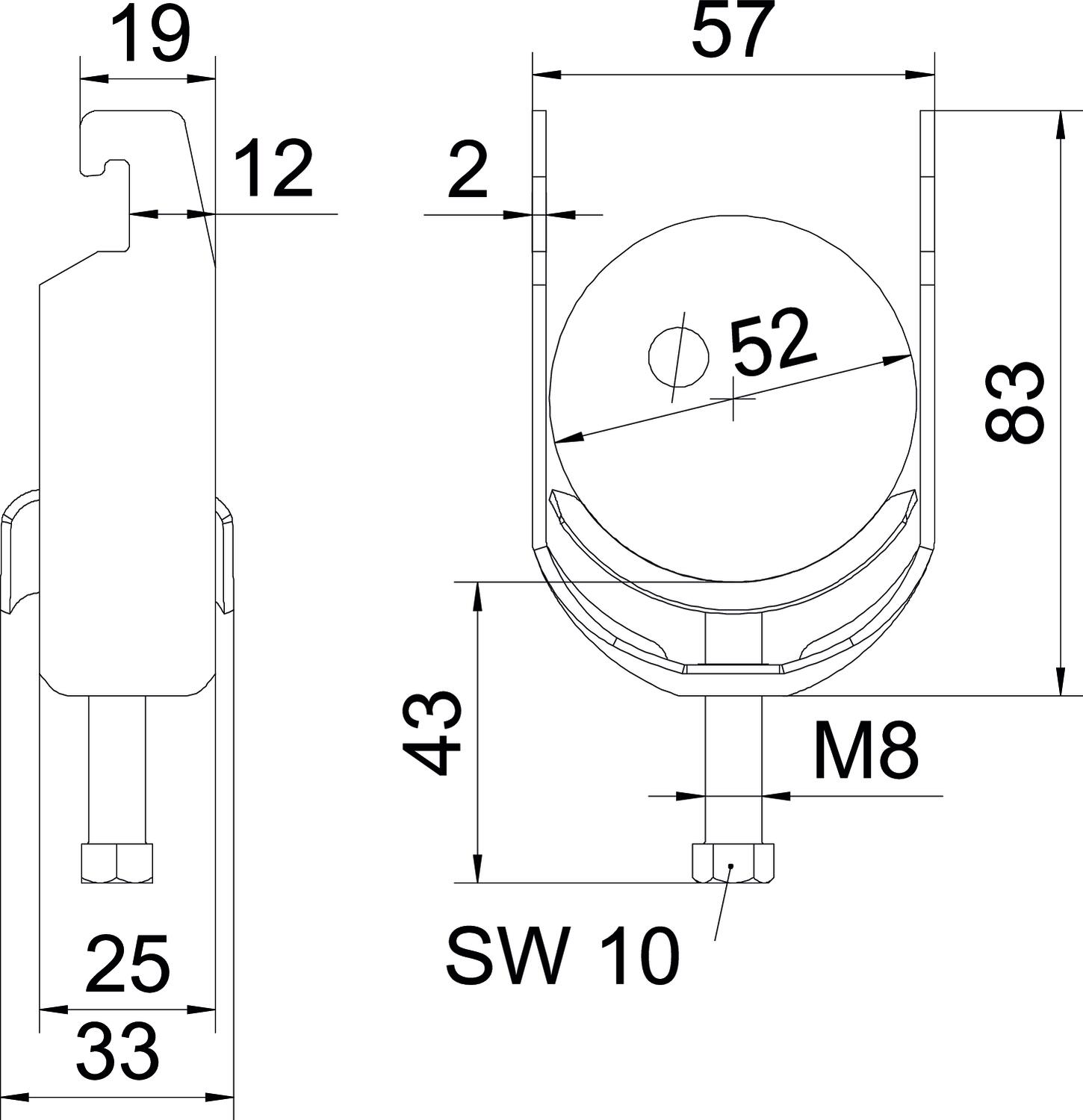 Obejma kabłąkowa ze stopką w kształcie U, metalowa wanienka dociskowa z zaokrąglonymi krawędziami do ochrony kabli. Do pionowego i poziomego montażu pojedynczego kabla na szynie o profilu C. Szerokość szczeliny 18-22 mm Z gwintem jednoskokowym na wanience dociskowej, łeb sześciokątny uniwersalny SW10, z rowkiem i łbem krzyżakowym Nadaje się do montażu wewnątrz i na zewnątrz Zalecamy użycie wanienki dociskowej