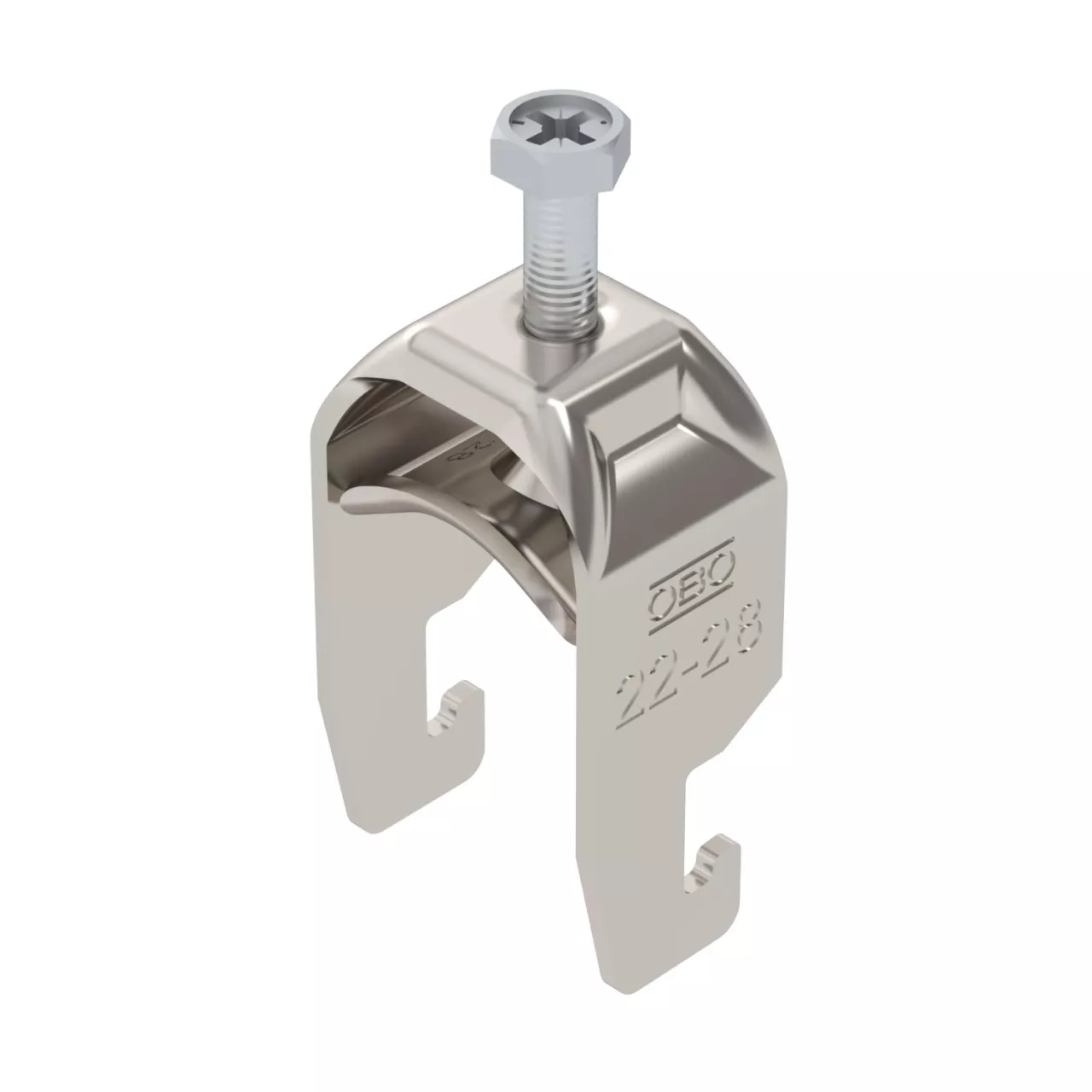 Obejma kabłąkowa ze stopką w kształcie U, metalowa wanienka dociskowa z zaokrąglonymi krawędziami do ochrony kabli. Do pionowego i poziomego montażu pojedynczego kabla na szynie o profilu C. Szerokość szczeliny 18-22 mm Z gwintem jednoskokowym na wanience dociskowej, łeb sześciokątny uniwersalny SW10, z rowkiem i łbem krzyżakowym Nadaje się do montażu wewnątrz i na zewnątrz Zalecamy użycie wanienki dociskowej