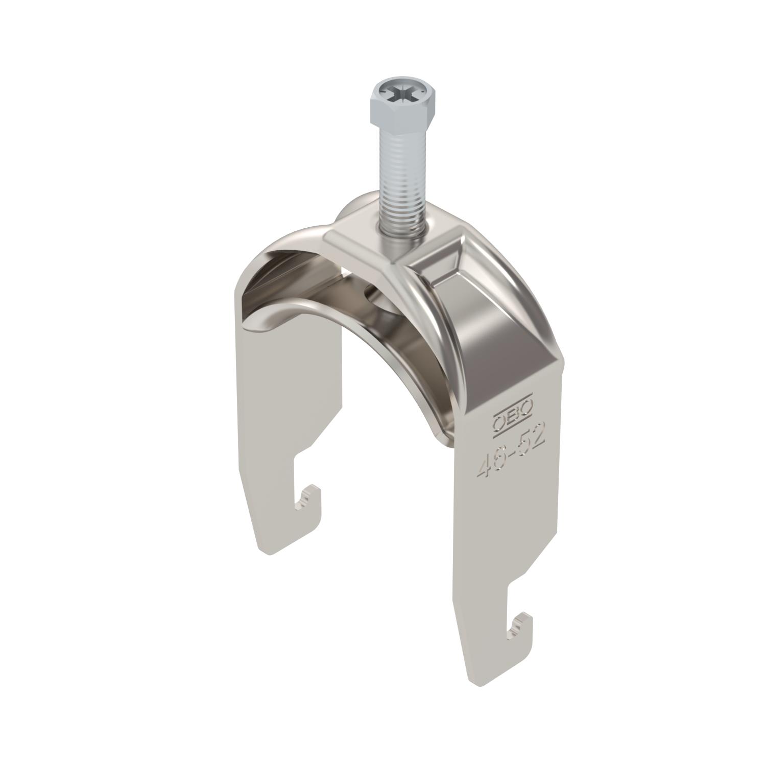 Obejma kabłąkowa ze stopką w kształcie U, metalowa wanienka dociskowa z zaokrąglonymi krawędziami do ochrony kabli. Do pionowego i poziomego montażu pojedynczego kabla na szynie o profilu C. Szerokość szczeliny 18-22 mm Z gwintem jednoskokowym na wanience dociskowej, łeb sześciokątny uniwersalny SW10, z rowkiem i łbem krzyżakowym Nadaje się do montażu wewnątrz i na zewnątrz Zalecamy użycie wanienki dociskowej