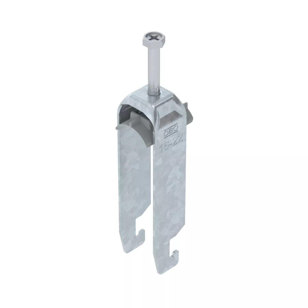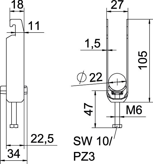 Obejma kabłąkowa plastikowa ze stopką w kształcie U, wanienka dociskowa wykonana z polipropylenu. Do pionowego i poziomego montażu 3 pojedynczych kabli na szynach o profilu C. Szerokość szczeliny 18-22 mm Z gwintem jednoskokowym na wanience dociskowej, łeb sześciokątny uniwersalny SW10, z rowkiem i łbem krzyżakowym Nadaje się do montażu wewnątrz i na zewnątrz Paczki kabli powinny być oddzielone dodatkową wanienką dociskową Zalecamy użycie wanienki dociskowej