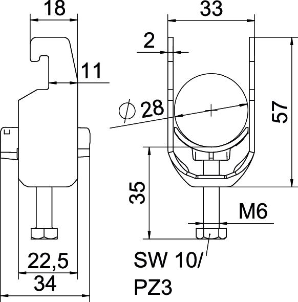 Obejma kabłąkowa plastikowa ze stopką w kształcie U, wanienka dociskowa wykonana z polipropylenu. Do pionowego i poziomego montażu pojedynczego kabla na szynie o profilu C. Szerokość szczeliny 18-22 mm Z gwintem jednoskokowym na wanience dociskowej, łeb sześciokątny uniwersalny SW10, z rowkiem i łbem krzyżakowym Nadaje się do montażu wewnątrz i na zewnątrz Zalecamy użycie wanienki dociskowej