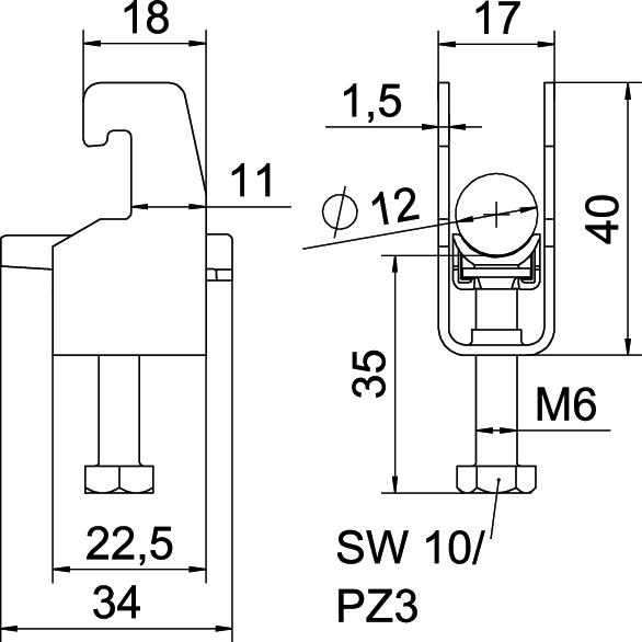 Obejma kabłąkowa plastikowa ze stopką w kształcie U, wanienka dociskowa wykonana z polipropylenu. Do pionowego i poziomego montażu pojedynczego kabla na szynie o profilu C. Szerokość szczeliny 18-22 mm Z gwintem jednoskokowym na wanience dociskowej, łeb sześciokątny uniwersalny SW10, z rowkiem i łbem krzyżakowym Nadaje się do montażu wewnątrz i na zewnątrz Zalecamy użycie wanienki dociskowej