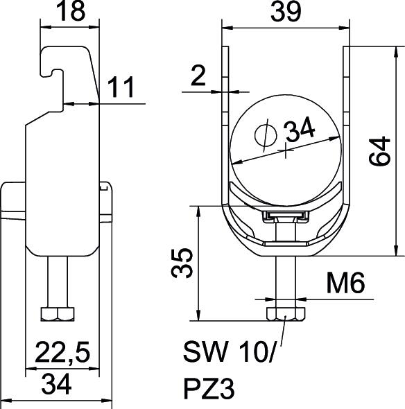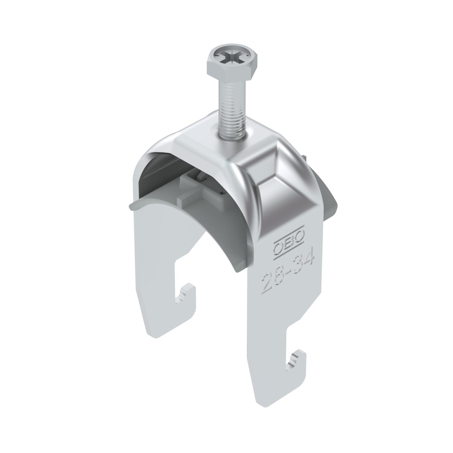 Obejma kabłąkowa plastikowa ze stopką w kształcie U, wanienka dociskowa wykonana z polipropylenu. Do pionowego i poziomego montażu pojedynczego kabla na szynie o profilu C. Szerokość szczeliny 18-22 mm Z gwintem jednoskokowym na wanience dociskowej, łeb sześciokątny uniwersalny SW10, z rowkiem i łbem krzyżakowym Nadaje się do montażu wewnątrz i na zewnątrz Zalecamy użycie wanienki dociskowej