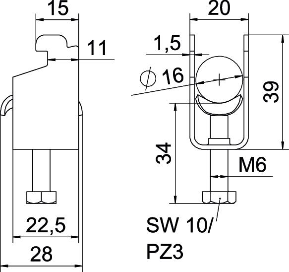 Obejma kabłąkowa, ze stopką typu N, metalowa wanienka dociskowa,z zaokrąglonymi krawędziami do ochrony kabli. Do pionowego i poziomego montażu pojedynczego kabla na szynie o profilu C. Do szczeliny o szerokości 11 - 12 mm. Z gwintem jednoskokowym na wanience dociskowej, łeb sześciokątny uniwersalny SW10, z rowkiem i łbem krzyżakowym Nadaje się do montażu wewnątrz i na zewnątrz Zalecamy użycie wanienki dociskowej