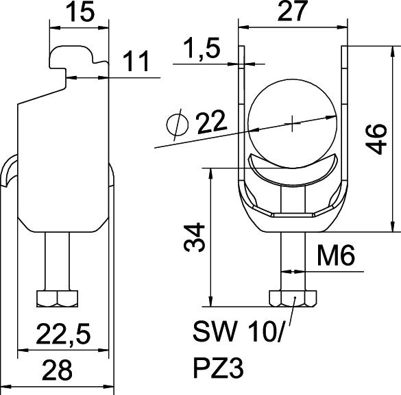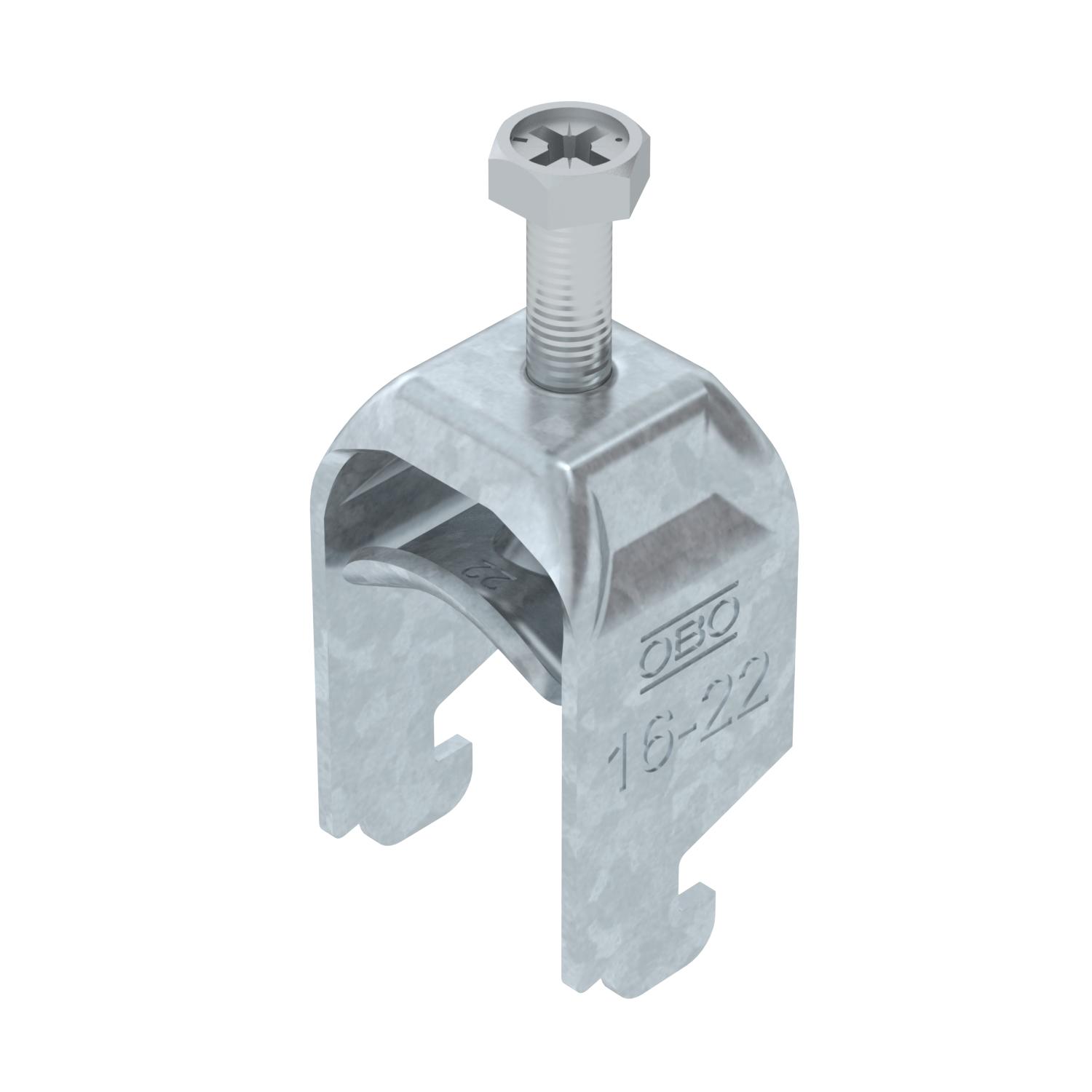 Obejma kabłąkowa, ze stopką typu N, metalowa wanienka dociskowa,z zaokrąglonymi krawędziami do ochrony kabli. Do pionowego i poziomego montażu pojedynczego kabla na szynie o profilu C. Do szczeliny o szerokości 11 - 12 mm. Z gwintem jednoskokowym na wanience dociskowej, łeb sześciokątny uniwersalny SW10, z rowkiem i łbem krzyżakowym Nadaje się do montażu wewnątrz i na zewnątrz Zalecamy użycie wanienki dociskowej