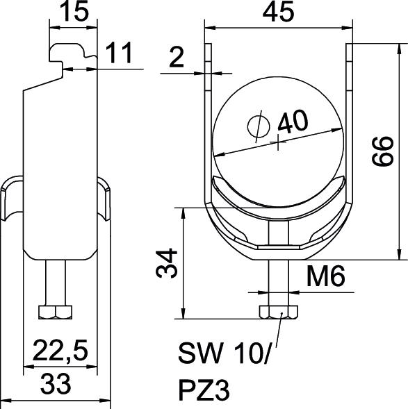 Obejma kabłąkowa, ze stopką typu N, metalowa wanienka dociskowa,z zaokrąglonymi krawędziami do ochrony kabli. Do pionowego i poziomego montażu pojedynczego kabla na szynie o profilu C. Do szczeliny o szerokości 11 - 12 mm. Z gwintem jednoskokowym na wanience dociskowej, łeb sześciokątny uniwersalny SW10, z rowkiem i łbem krzyżakowym Nadaje się do montażu wewnątrz i na zewnątrz Zalecamy użycie wanienki dociskowej