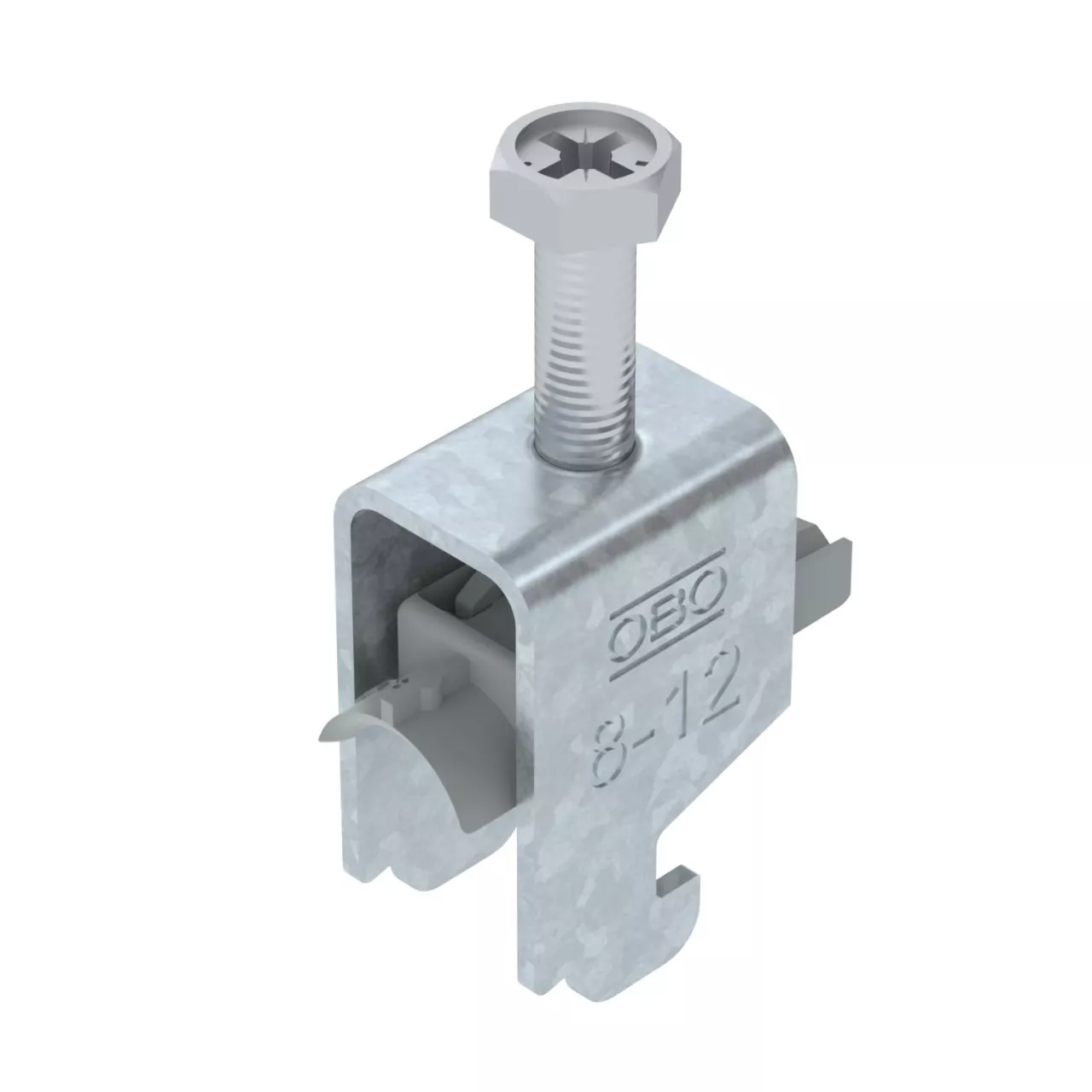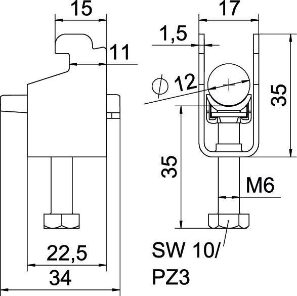 Obejma kabłąkowa, ze stopką typu N, plastikowa wanienka dociskowa wykonana z polipropylenu. Do pionowego i poziomego montażu pojedynczego kabla na szynie o profilu C. Do szczeliny o szerokości 11 - 12 mm. Z gwintem jednoskokowym na wanience dociskowej, łeb sześciokątny uniwersalny SW10, z rowkiem i łbem krzyżakowym Nadaje się do montażu wewnątrz i na zewnątrz Zalecamy użycie wanienki dociskowej