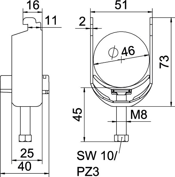 Obejma kabłąkowa, ze stopką typu N, plastikowa wanienka dociskowa wykonana z polipropylenu. Do pionowego i poziomego montażu pojedynczego kabla na szynie o profilu C. Do szczeliny o szerokości 11 - 12 mm. Z gwintem jednoskokowym na wanience dociskowej, łeb sześciokątny uniwersalny SW10, z rowkiem i łbem krzyżakowym Nadaje się do montażu wewnątrz i na zewnątrz Zalecamy użycie wanienki dociskowej